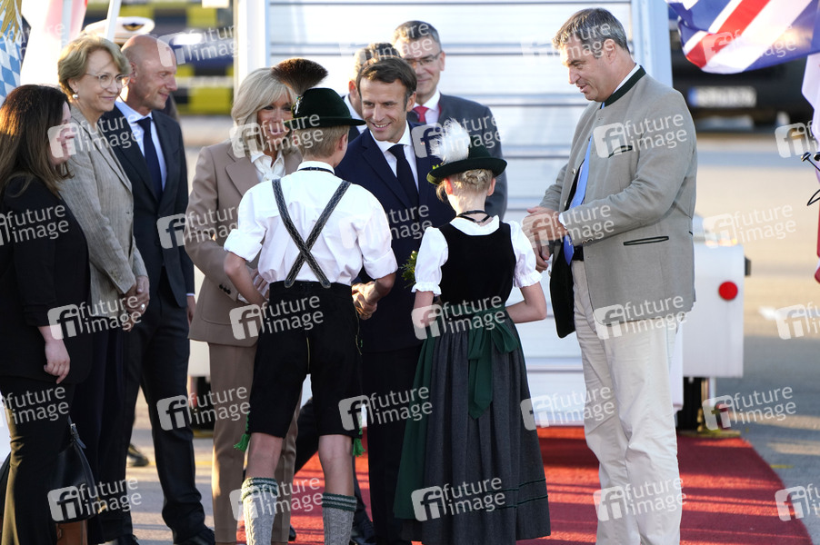 Emmanuel Macron mit Ehefrau Brigitte Macron und Markus Söder bei der Ankunft von Präsident Macron zum G7-Gipfel am Flughafen München Franz Josef Strauß. München, 25.06.2022
