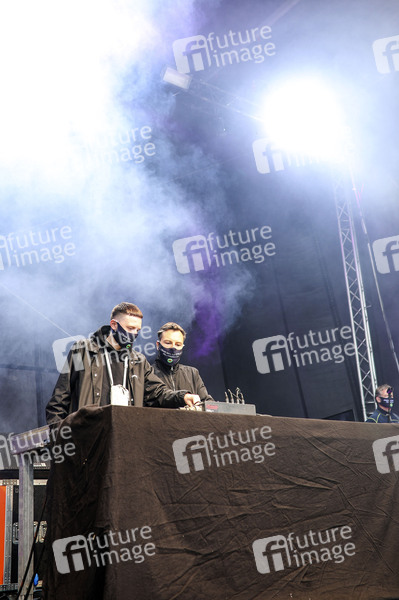 ESKEI83 und Purple Disco Machine bei einem fünfminütigen DJ-Set bei der Demonstration 'Ohne uns ist Stille' der Organisation 'Leere Stühle' auf dem Theaterplatz in der historischen Dresdner Altstadt. Künstler, Veranstalter und Unternehmen der Veranstaltungsbranche wie Caterer und Techniker demonstrieren gemeinsem, um auf die Probleme und Wichtigkeit ihrer Branche aufmerksam zu machen. Dredsen, 05.06.2020