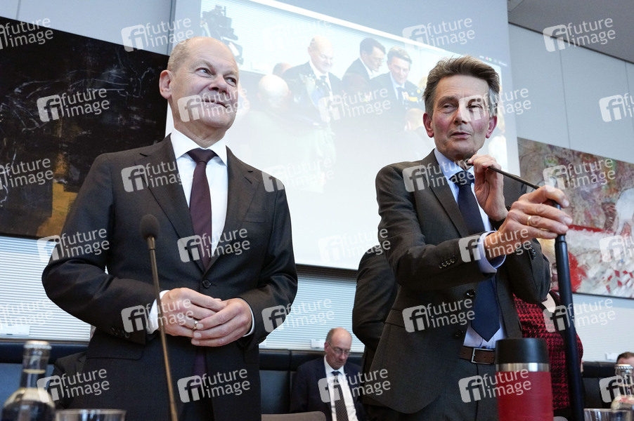 Olaf Scholz und Rolf Mützenich bei der Fraktionssitzung der SPD-Bundestagsfraktion im Reichstagsgebäude. Berlin, 08.10.2024
