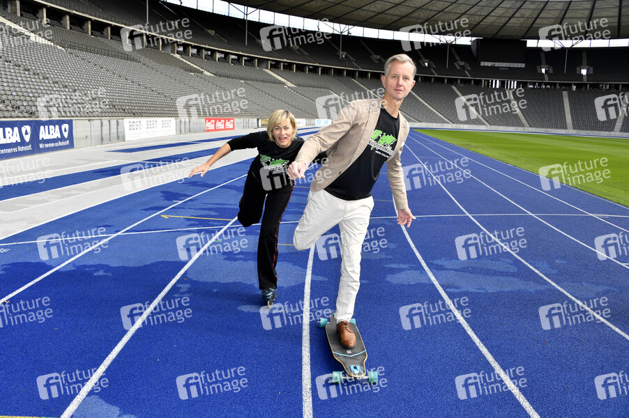 Max Raabe und Gesine Cukrowski beim Fototermin zur sportichen '#WocheChallenge' im Olympiastation Berlin. Unter dem Motto 'Wir können was bewegen!' ruft die Welthungerhilfe zu dieser Challenge auf und bittet um Spenden für eine Welt ohne Hunger. Berlin, 09.10.2020