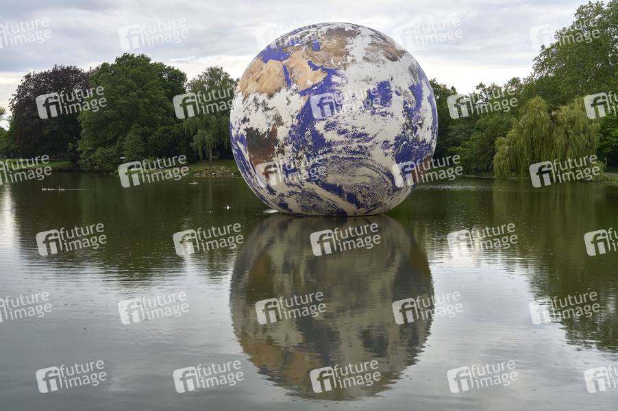 Deutschlandpremiere der Kunstinstallation Floating Earth (schwimmende Weltkugel) des britischen Künstlers Luke Jerram auf dem Maschteich. (Fotos der Kunstinstallation sind vom Künstler für Presse- und Öffentlichkeitsarbeit freigegeben) Hannover, 16.05.2024
