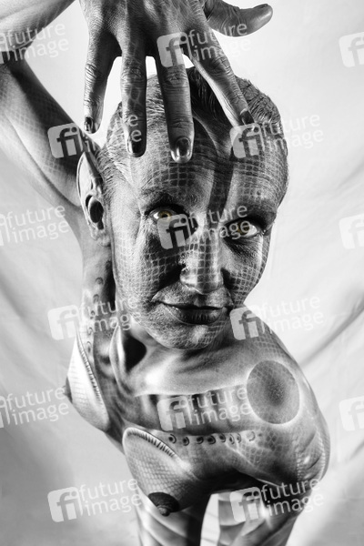 Bodypainting, Erotik, Frau, nackt, drinnen, weiblich, Monster, Außerirdische, Alien, Echse, Körperkunst, Kunst, Malerei, monochrom, erotic, woman, nude, indoor, female, monochrome, lizard, body art, body painting