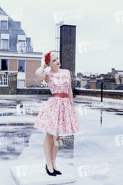 Paula Yates bei einer Modepräsentation auf einem Dach. London, 15.09.1987