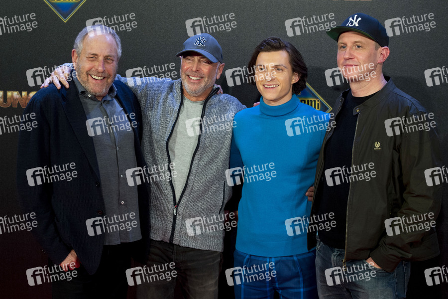 Charles Roven, Alex Gartner, Tom Holland und Ruben Fleischer bei der Premiere des Kinofilms 'Uncharted' im El Hormiguero. Madrid, 08.02.2022