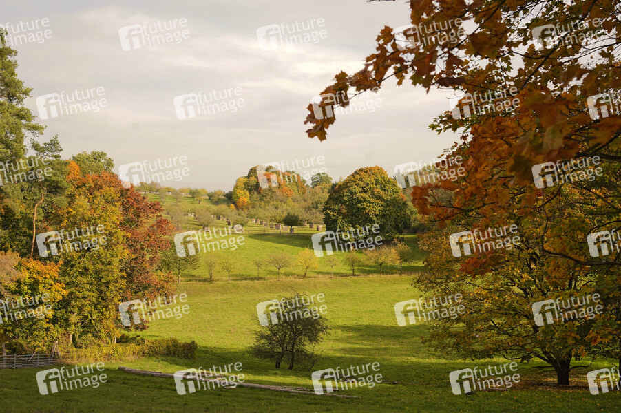 Herbstimpression, bunt, Herbstblätter, buntes Herbstlaub, Blätter, Herbst, Herbstfarben, herbstlich, Herbstspaziergang, Herbststimmung, Herbsttag, Herbstwetter, herstblich, Laub, Gras, Hügel, Senke, sonnig, Streuobstwiese, Tal, Weide, Wiese, Symbolbild, Symbolfoto