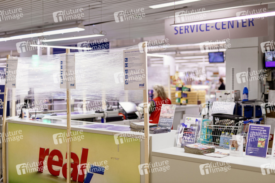 Schutzmaßnahmen gegen Corona in einem Real Supermarkt in Sülz. Köln, 27.03.2020