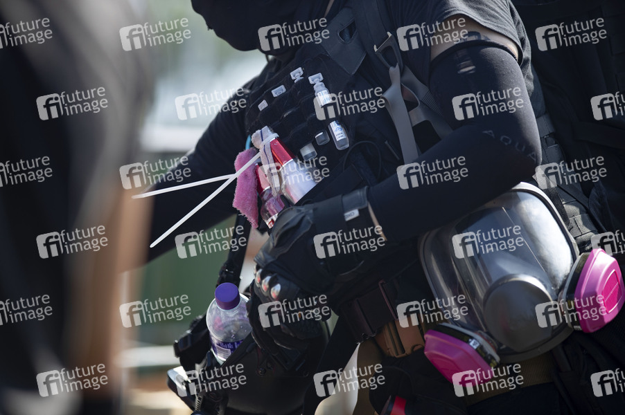 Molotowcocktails und Wasser werden an der taktischen Weste befestigt - Kampf an der Chinese University Hong Kong (CUHK). Hongkong protestiert seit fünf Monaten ununterbrochen. Am Montag, dem 11. November 2019, begann ein Streik in der ganzen Stadt, der Teile von Hongkong zum Erliegen brachte, als MTR-Stationen geschlossen und mehrere Straßensperren errichtet wurden. Hongkong, 13.11.2019