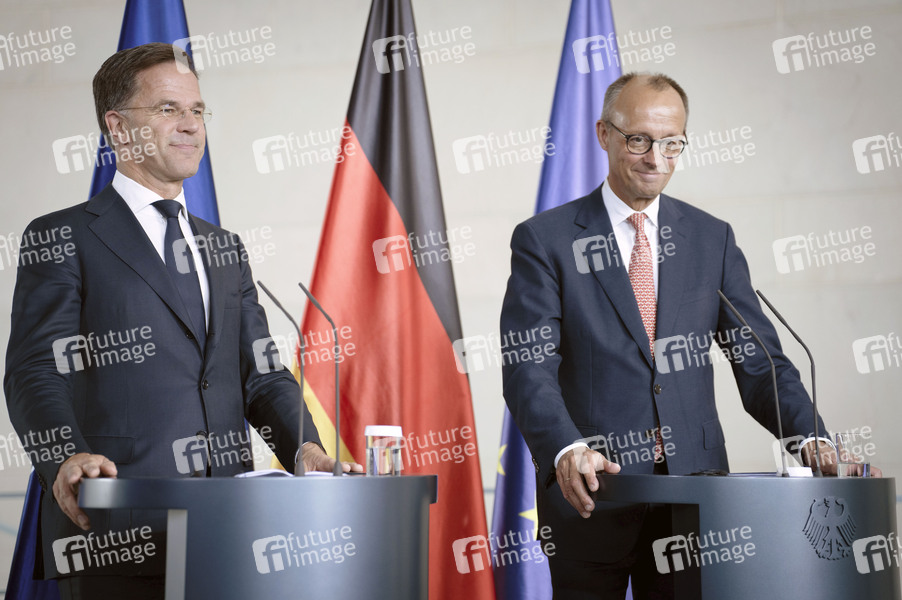Mark Rutte und Friedrich Merz beim Empfang des NATO-Generalsekretärs zu einem gemeinsamen mit anschließendem Pressestatement im Bundeskanzleramt. Berlin, 09.07.2025
