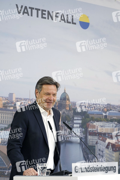 Robert Habeck bei der Grundsteinlegung einer Abwassergroßwärmepumpe von Vattenfall und Befüllen einer Zeitkapsel auf dem Kraftwerksgelände Reuter-West. Berlin, 12.03.2024