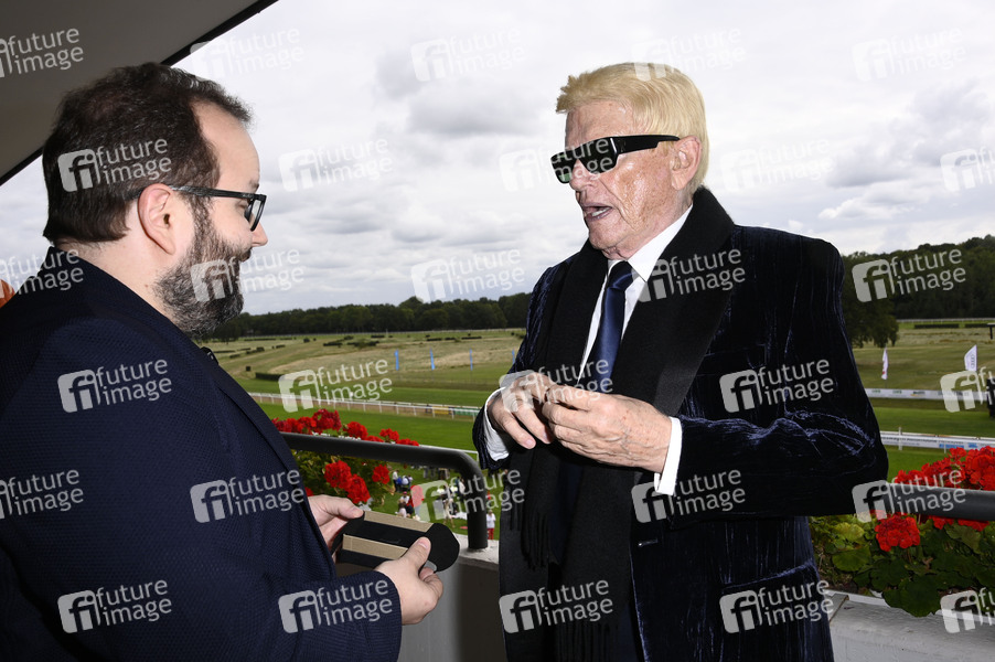 Stephan Richter von Juwel 1 überreicht Heino einen Ring mutmaßlich aus dem Nachlass von Rudolph Moshammer beim Audi Ascot Renntag 2025 auf der Galopprennbahn Neue Bult. Hannover-Langenhagen, 24.08.2025