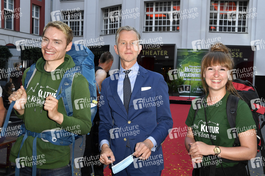 Meik Gudermann, Max Raabe und Laura Kuhlen beim Fototermin zur Aktion '750 Kulturkilometer' von Köln nach Berlin, um die Menschen während der Corona-Krise für die aktuelle Problemlage der Kulturlandschaft zu sensibilisieren, im Admiralspalast. Berlin, 23.06.2020