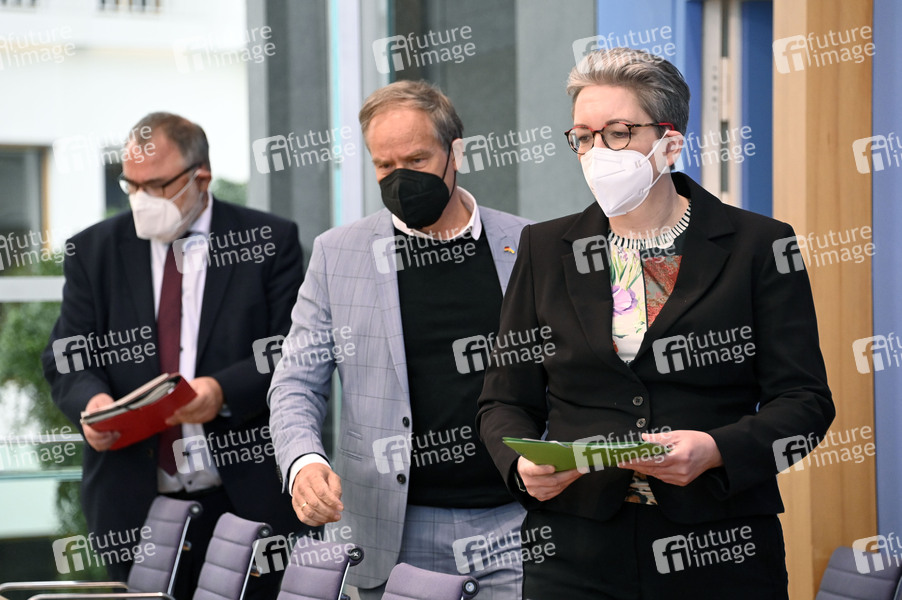 Markus Eltges, Eckart Würzner und Klara Geywitz bei der Pressekonferenz Bundesweite Baulandumfrage im Haus der Bundespressekonferenz. Berlin, 29.03.2022