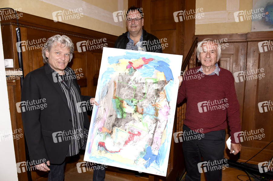 Ernst Hannawald mit Arno Linke und Peter Vaitl vor seiner Lesung aus dem Buch 'Das Leben ist kein Film' in der SeelenArt Kunst Kultur Galerie im Kleinen Theater. Haar, 30.09.2021