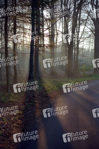 Wald, Morgen, Nebel, Fruehling, Fruehjahr, Jahreszeit, Waldweg, Wandel, Erwachen, Perspektive, Richtung, Gegenlicht, Zwielicht