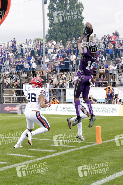 Marvin Omar Gesellnsetter (Hamburg Sea Devils DB) und Niklas Schumm (Frankfurt Galaxy WR) beim American Football-Spiel Frankfurt Galaxy gegen Hamburg Sea Devils in der PSD Bank Arena. Frankfurt am Main, 30.06.2024