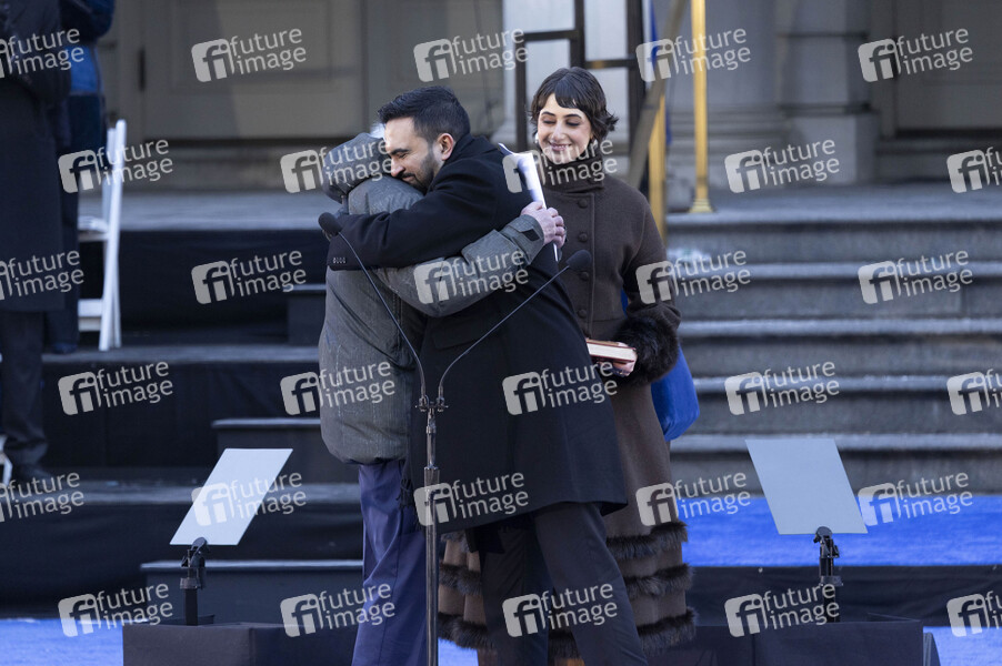 Bernie Sanders, Zohran Mamdani und Rama Duwaji bei der Amtseinführung von Zohran Mamdani zum ersten muslimischen Bürgermeister von New York City in Rathaus. New York, 01.01.2026