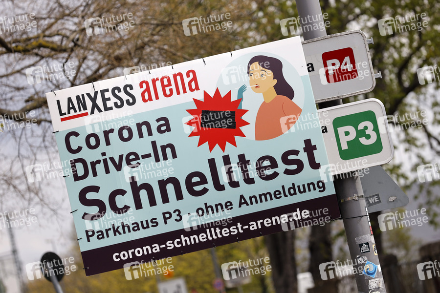 Mit dem 'Bürgertest' haben alle Einwohner Deutschlands die Möglichkeit, sich kostenlos auf eine Infektion mit dem Corona-Virus testen zu lassen. Die Drive-in-Teststation an der Lanxess-Arena bietet diese Möglichkeit jetzt ohne Begrenzung an. (Symbolbild, Themenbild) Köln, 15.04.2021