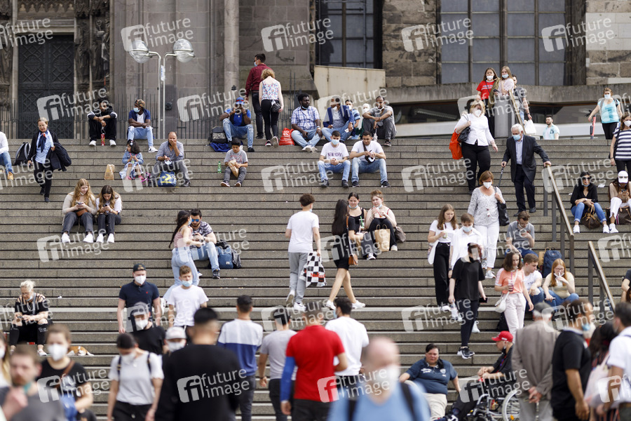 Bei fallenden Inzidenzzahlen und steigenden Temperaturen drängen sich viele Menschen in der Kölner Innenstadt auf der Domtreppe. In Nordrhein-Westfalen gelten weitere Öffnungsschritte, sie ergänzen die Lockerungen, die in der Coronaschutzverordnung vom vorgesehen sind. Es gilt ein Stufenplan mit Öffnungsschritten für die Landkreise und kreisfreien Städten ohne Notbremse, also mit einer stabilen Sieben-Tage-Inzidenz von unter 100. (Themenbild, Symbolbild) Köln, 04.06.2021
