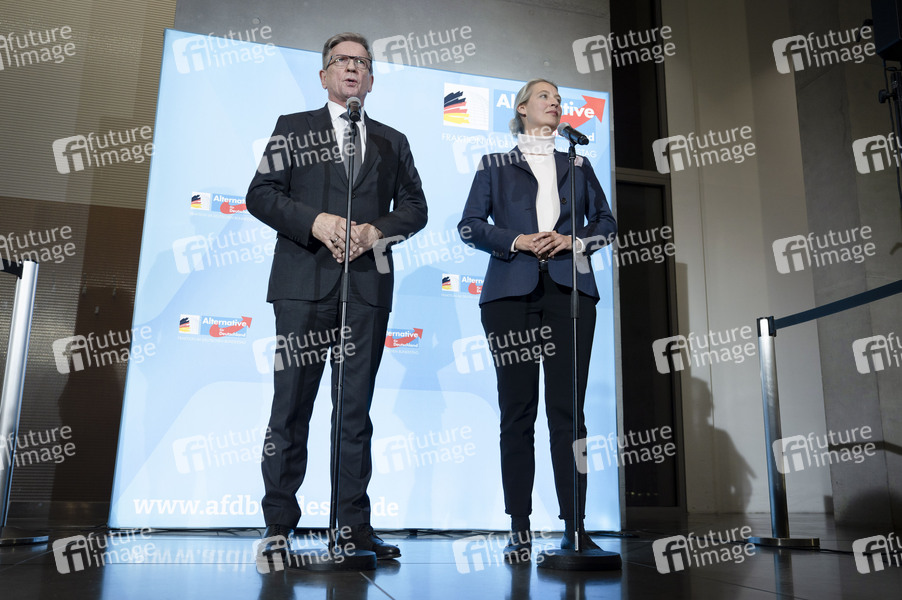 Gerold Otten und Alice Weidel beim Pressestatement zur Fraktionssitzung der AfD-Bundestagsfraktion im Reichstagsgebäude. Berlin, 24.03.2025