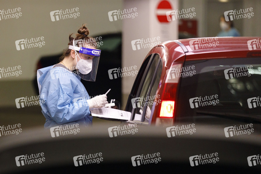 Mit dem 'Bürgertest' haben alle Einwohner Deutschlands die Möglichkeit, sich kostenlos auf eine Infektion mit dem Corona-Virus testen zu lassen. Die Drive-in-Teststation an der Lanxess-Arena bietet diese Möglichkeit jetzt ohne Begrenzung an. (Symbolbild, Themenbild) Köln, 15.04.2021