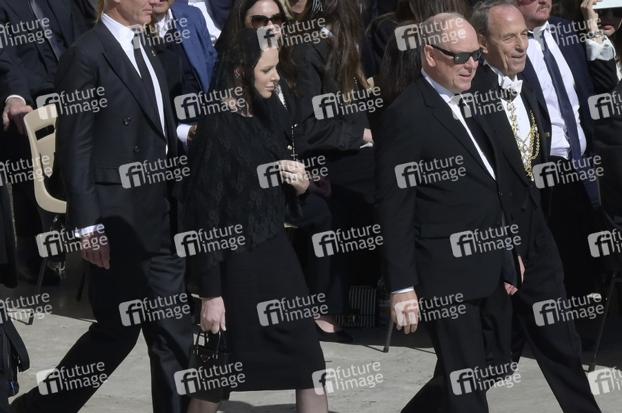 Albert II. von Monaco mit Ehefrau Charlene von Monaco bei der Trauermesse für den verstorbenen Papst Franziskus auf dem Petersplatz. Vatikanstadt, 26.04.2025