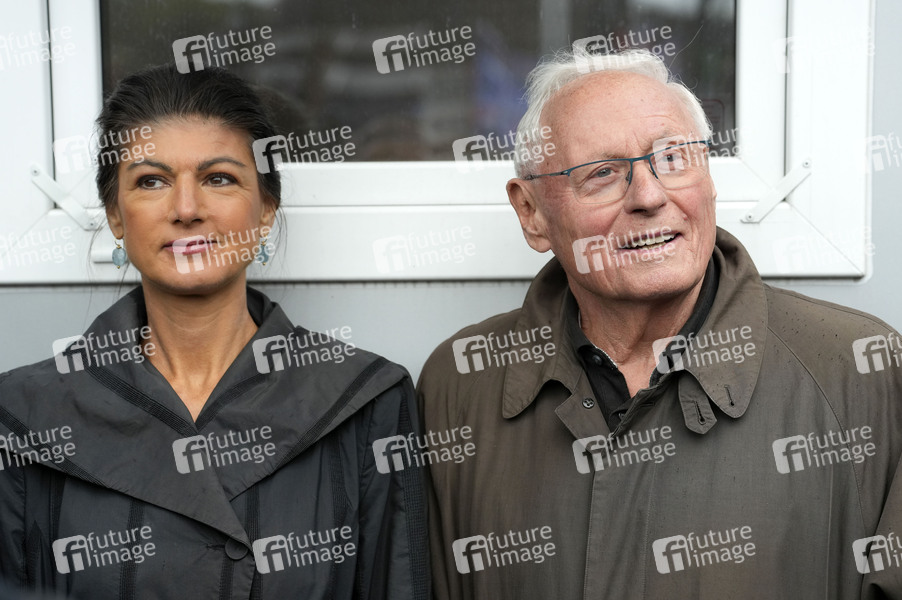 Sahra Wagenknecht und Oskar Lafontaine bei der Friedensdemonstration unter dem Motto 'Nein zu Krieg und Hochrüstung! Ja zu Frieden und internationaler Solidarität' vor der Siedessäule am Großen Stern. Berlin, 03.10.2024