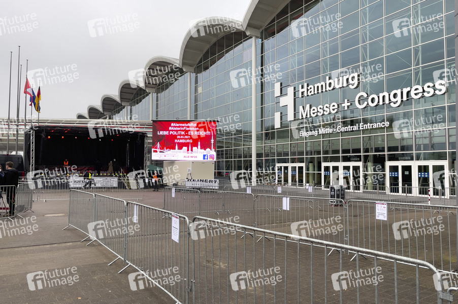 Protest-Veranstaltung Alarmstufe Rot - Alster in Flammen an den Messehallen am Heinrich-Hertz-Funkturm. Die Veranstalter wollen ein Zeichen setzen, dass mit vernünftigen Sicherheits- & Hygienemaßnahmen ( Testung, Anmeldung, App ) Öffnungen wie Gastronomie, Theater, Kinos, Fitnessstudios, entsprechende kulturelle Veranstaltungen etc. machbar sind. Hamburg, 20.03.2021