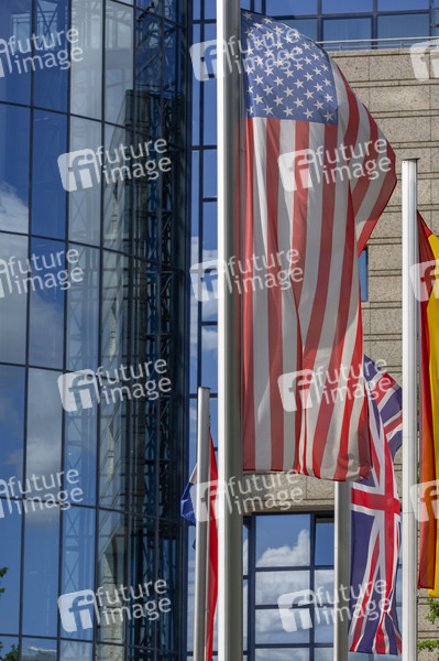 Flaggen Vereinigte Staaten von Amerika und Vereinigtes Königreich vor dem Maritim Hotel Bonn