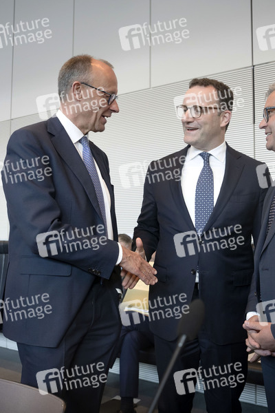 Friedrich Merz und Jens Spahn bei der Fraktionssitzung der CDU/CSU-Bundestagsfraktion im Reichstagsgebäude. Berlin, 20.05.2025