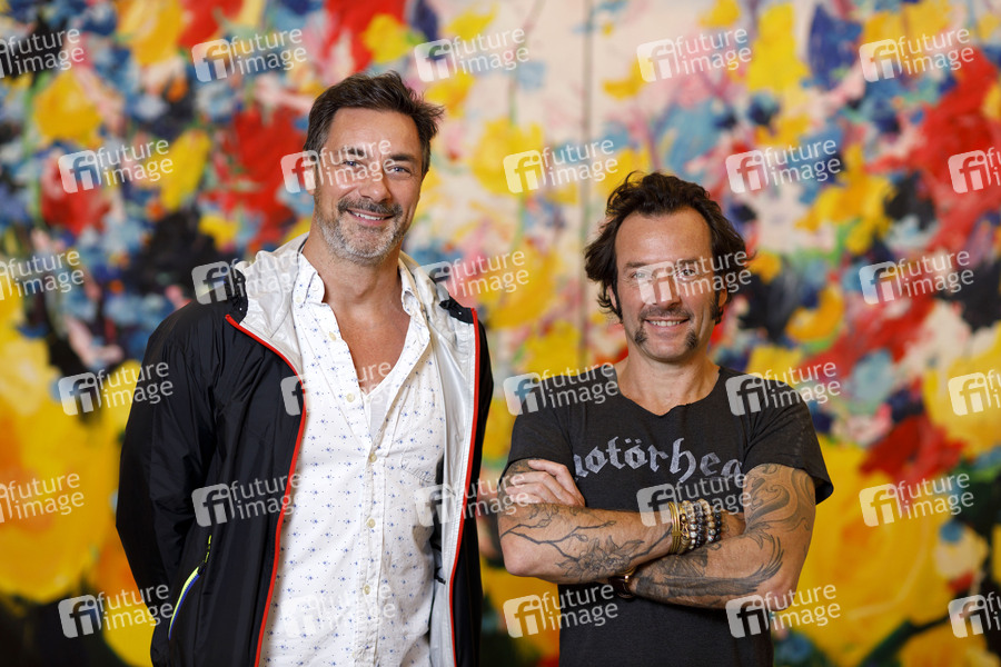 Marco Schreyl und Arne Quinze bei der Eröffnung der Ausstellung 'My Secret Garden' in der Galerie Martina Kaiser. Köln, 04.09.2020