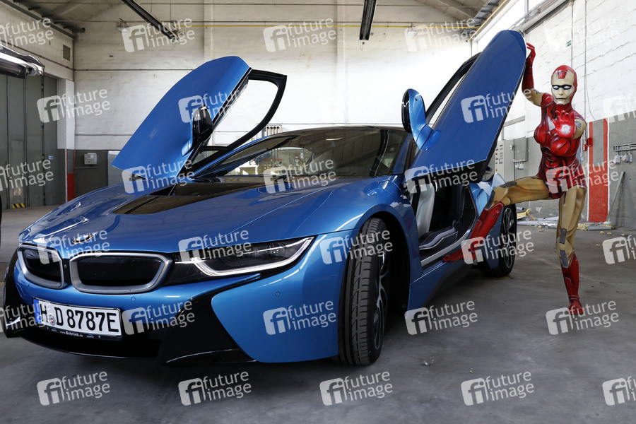 Projekt Farbkörper, Cosplay, Cosplayer, Bodypainting, Body-Painting, Make-up, Latexappliaktionen, Latexteile, Maskenbildnerei, Maskenbildner Körperkunst, Körperfarben, Farbe, Bemalung, Kunst, Malerei, Superheld, Superheldin, Comics, Comicfigur, Marvel, Iron Man, BMW i8, Hybrid Sportwagen, Stromauto, Elektroauto, Elektrofahrzeuge, Elektromobilität, unweltfreundlich, electric car, electric vehicles, electromobility, body painting, body art, superhero, super heroine, project color body, colors, colours