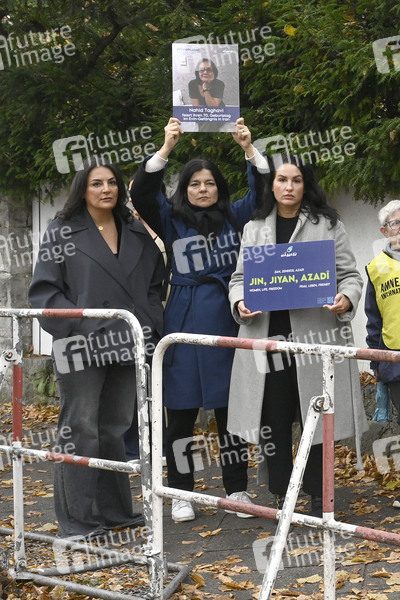 Düzen Tekkal, Jasmin Tabatabai und Minu Barati bei einer Protestaktion vor der Botschaft der Islamischen Republik Iran nach der Hinrichtung des Deutsch-Iraners Jamshid Sharmahd. Berlin, 29.10.2024
