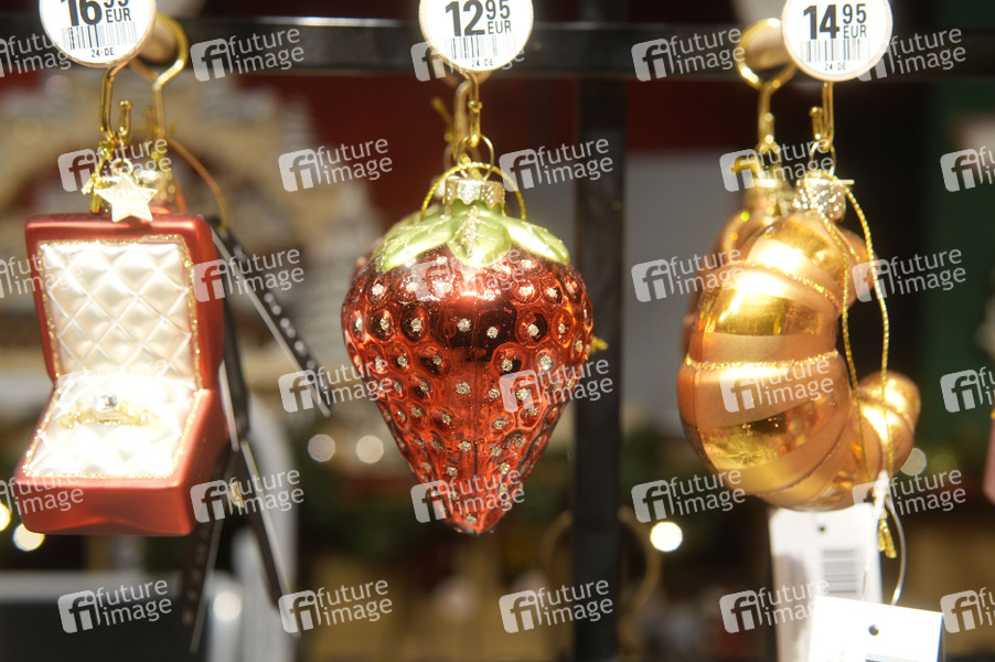 Ringschatulle-, Erdbeere- und Croissant-Weihnachtsbaumanhänger auf dem City-Weihnachtsmarkt an der Gedächtniskirche auf dem Breitscheidplatz. Berlin, 16.12.2024