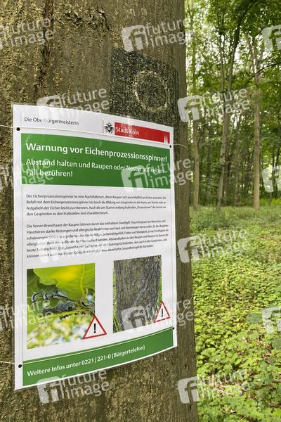 Absperrung und Hinweis auf die starke Ausbreitung der Eichenprozessionsspinner in Waldgebieten um Köln. Die Stadt Köln informiert mit großen Schildern. Die Raupen des Eichenprozessionsspinners sind mit ihren giftigen Brennhaaren gefährlich für Menschen und lösen Allergien aus. Köln, 25.06.2020