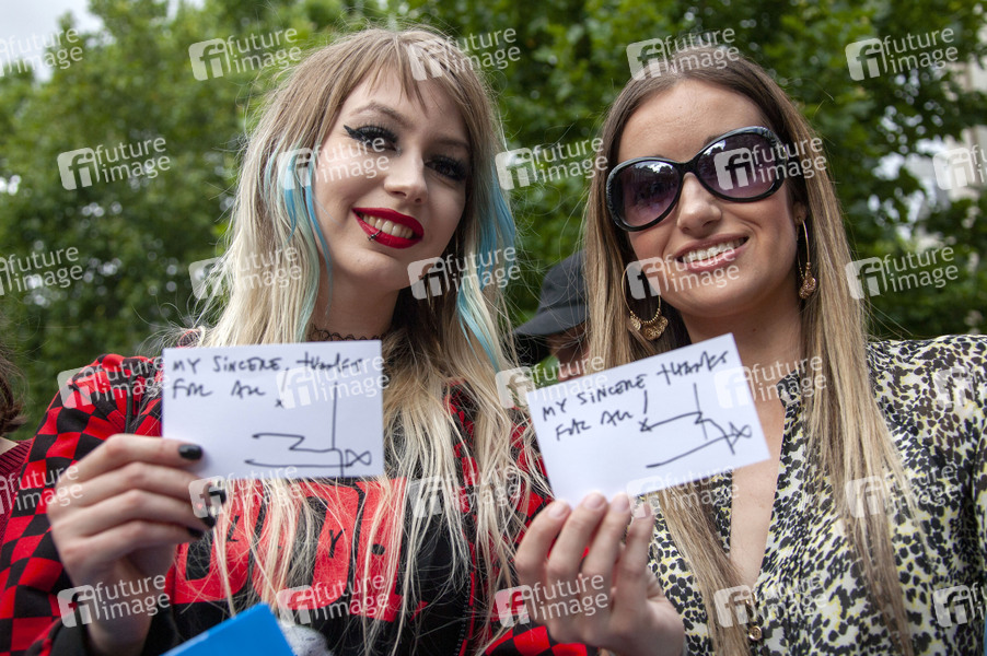 Charlotte Pitson und Johnny Depp Fan Lauren Hill vor dem High Court of Justice mit von Depp signierten Souvenirs, welcher er anlässlich des letzten Prozesstages der Verleumdungsklage Johnny Depp gegen die Zeitung The Sun von seinem Team verteilen ließ. London, 28.07.2020