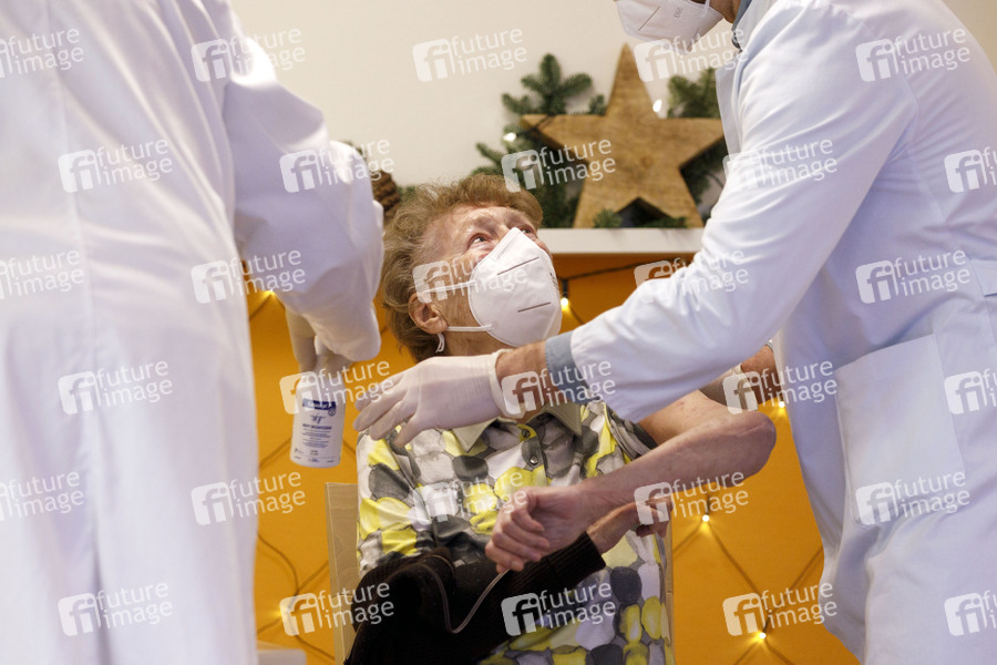 Heimbewohner beim Fototermin zum Impfbeginn in Köln. Zum Impfstart in Köln werden Senioren und Mitarbeiter der Kölner Sozialbetriebe mit dem Corona-Impfstoff von Biontech Pfizer geimpft. Als erste Kölnerin erhielt die 92-jährige Gertrud Vogel, eine Pflegeheimbewohnerin des Seniorenzentrum Riehl das Vakzin. Köln, 27.12.2020