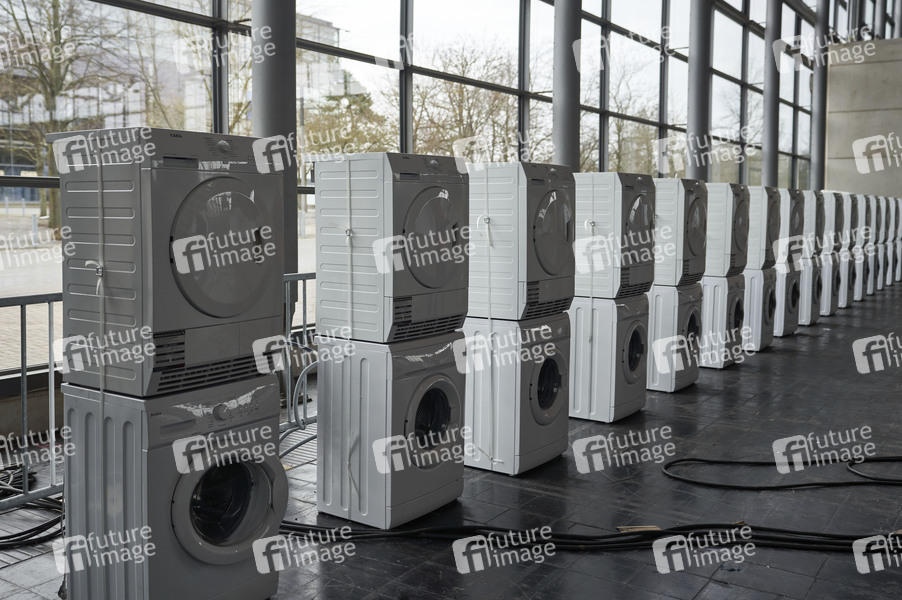 Waschmaschinen und Trockner - Zeltdörfer-Unterkünfte für ukrainische Kriegsflüchtlinge in der Halle 27 auf dem Messegelände, inklusive Wasch- und Duschmöglichkeiten, errichtet von der Feuerwehr Hannover. Die spätere Versorgung erfolgt durch das DRK. Hannover, 06.03.2022