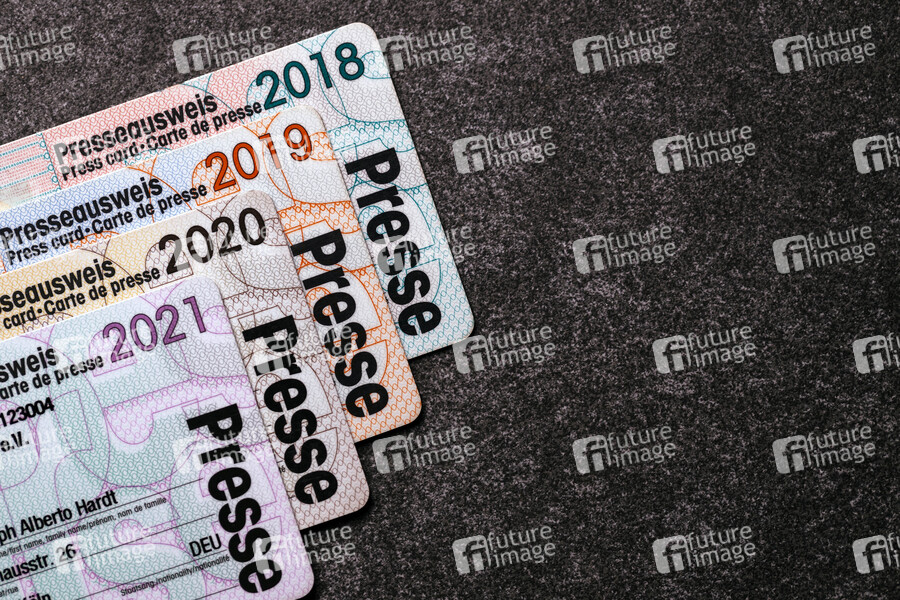 Presseausweise liegen auf einer Platte. (Themenbild, Symbolbild)