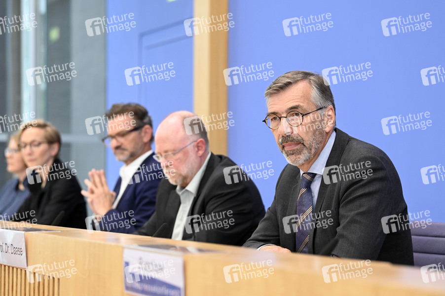 Claudia Baumgart-Ochse, Ursula Schröder, Conrad Schetter, Tobias Debiel und Christopher Daase bei der Bundespressekonferenz 'Friedensgutachten 2025' im Haus der Bundespressekonferenz. Berlin, 02.06.2025