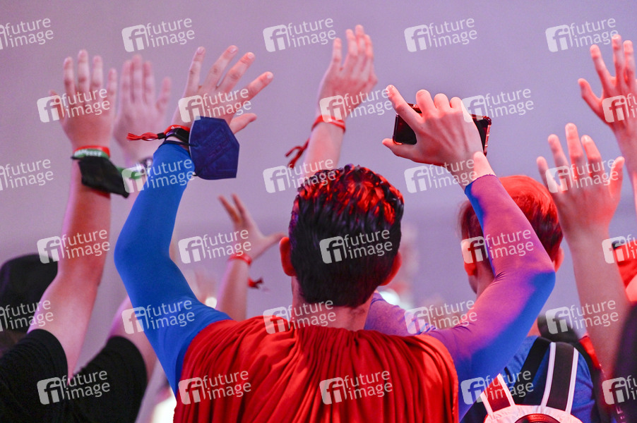 Messebesucher auf der Gamescom 2022 auf dem Gelände der Kölnmesse. Die Gamescom ist die weltweit größte Messe für Computer- und Videospiele, gemessen nach Ausstellungsfläche und Besucheranzahl. Zahlreiche Hersteller aus aller Welt präsentieren hier ihre neue Soft- und Hardware. Köln, 25.08.2022