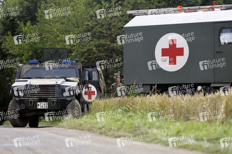 In der Eifel haben heftige Regenfälle und Dauerregen für Überschwemmungen und Überflutungen gesorgt. Im Ahrtal trat der Fluss vielerorts über die Ufer und überschwemmte nicht nur Keller sondern ganze Ortschaften. Im Bild das Camp der Rettungskräfte in den Bergen über dem Ort Dernau (Landkreis Ahrweiler), der beinahe komplett von den Wassermassen geflutet wurde. Viele Menschen verloren alles. Dernau, 15.07.2021