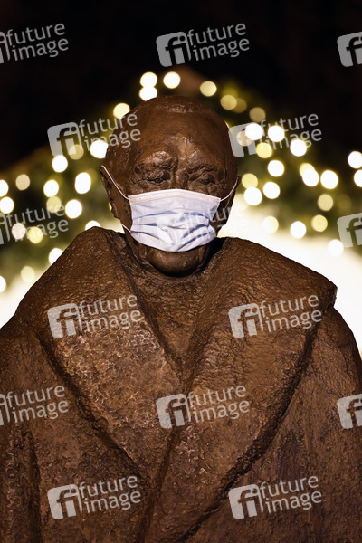 Ein Denkmal von Konrad Adenauer am Neumarkt steht mit OP-Maske vor einer Weihnachtsbude. Die meisten Weihnachtsmärkte in NRW werden dieses Jahr trotz ausgerufener Corona-Pandemie stattfinden. Flächendeckend wird dabei die 2G-Regel gelten. (Themenbild, Symbolbild) Köln, 16.11.2021