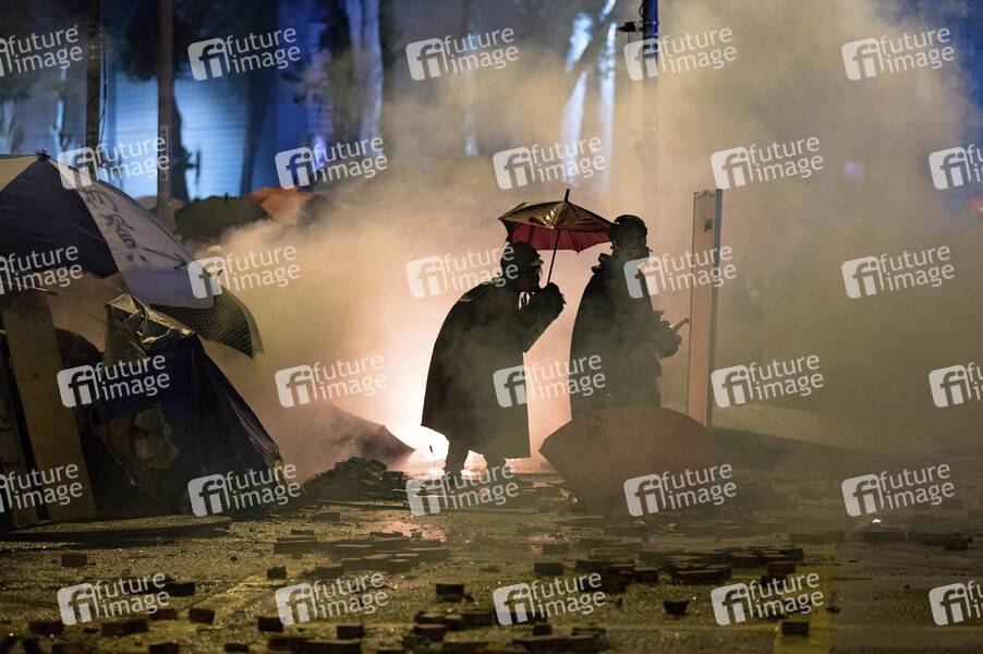 Tränengaswolken umhüllen Demonstranten auf der Cheong Wan Road