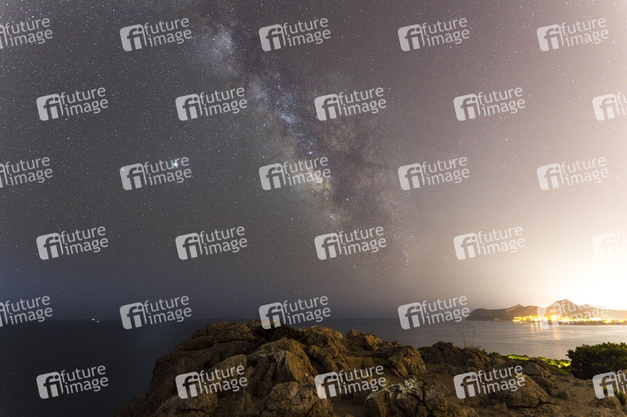 Die Milchstraße über Cala Rajada. Das Milchstraßensystem besteht aus etwa 100 bis 300 Milliarden Sternen und großen Mengen interstellarer und Dunkler Materie. Cala Rajada, 20.07.2020