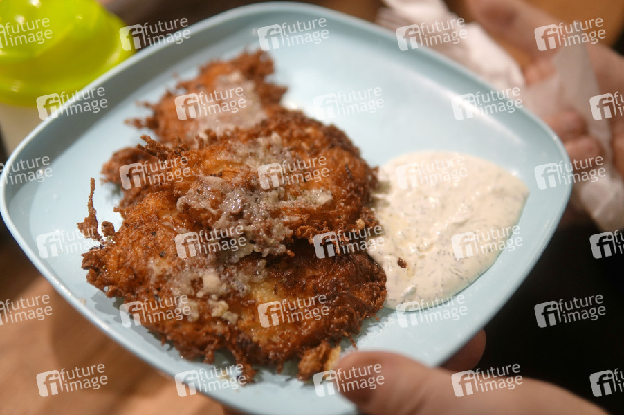 Kartoffelpuffer mit weißer Soße auf dem Lucia Weihnachtsmarkt in der Kulturbrauerei. Berlin, 21.12.2024