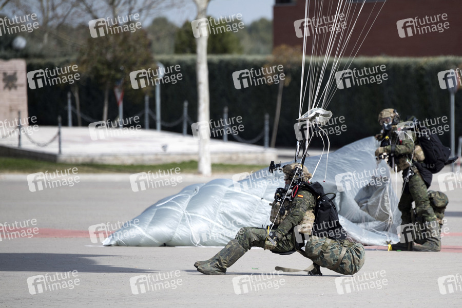 Fallschirmjäger bei der Flaggenzeremonie der Fallschirmjägerbrigade Almogávares auf der Princip Base. Paracuellos de Jarama, 23.02.2019