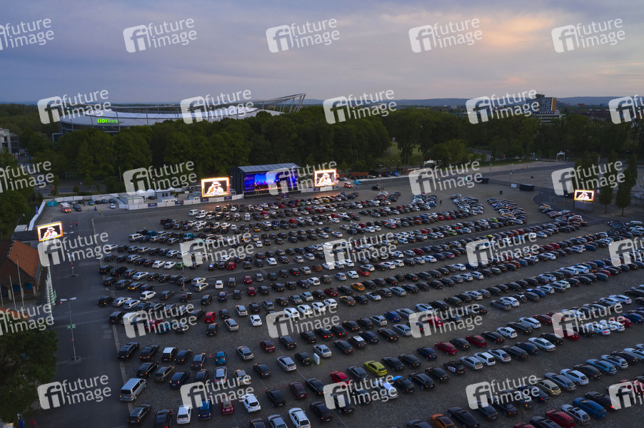 Sänger, Musiker, Rap, Hip Hop, Prominenz, Celebrity, Celebrities, Auftritt, Bühne, Stage, live, Unterhaltung, Entertainment, Kultur, Corona, Sars-CoV-2, Covid-19, Coronavirus, Coronakrise, Corona-Krise, Corona-Pandemie, Coronamaßnahmen, Corona-Schutz, Kontaktverbot, Mindestabstand, Social Distancing, Abstand, Abstandhalten, Abstandsregel, Auto, Autokonzertreihe, Luftaufnahmen, Luftbild