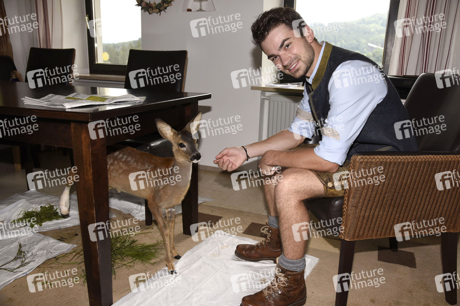 Andreas Hastreiter bei einem exklusiven Photoshooting auf dem Hof seiner Familie. Andreas zieht gerade ein verwaistes Rehkitz per Hand auf. Kollnburg, 31.08.2021