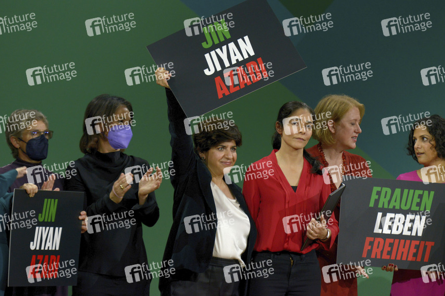 Annalena Baerbock, Pegah Ferydoni, Lisa Paus u.a. bei einer Solidaritätsbekundung mit den Frauen bei den Protesten im Iran bei der 48. Ordentlichen Bundesdelegiertenkonferenz von Bündnis90/Die Grünen im World Conference Center. Bonn, 15.10.2022
