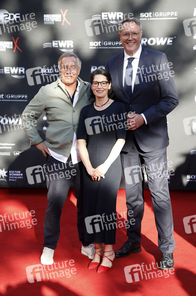 Nico Hofmann, Barbara Schweitzer und Alexander Schweitzer bei der Premiere des Stücks 'See aus Asche - Das Lied der Nibelungen' der Nibelungen-Festspiele 2025 auf der Open-Air-Bühne vor dem Wormser Dom. Worms, 11.07.2025